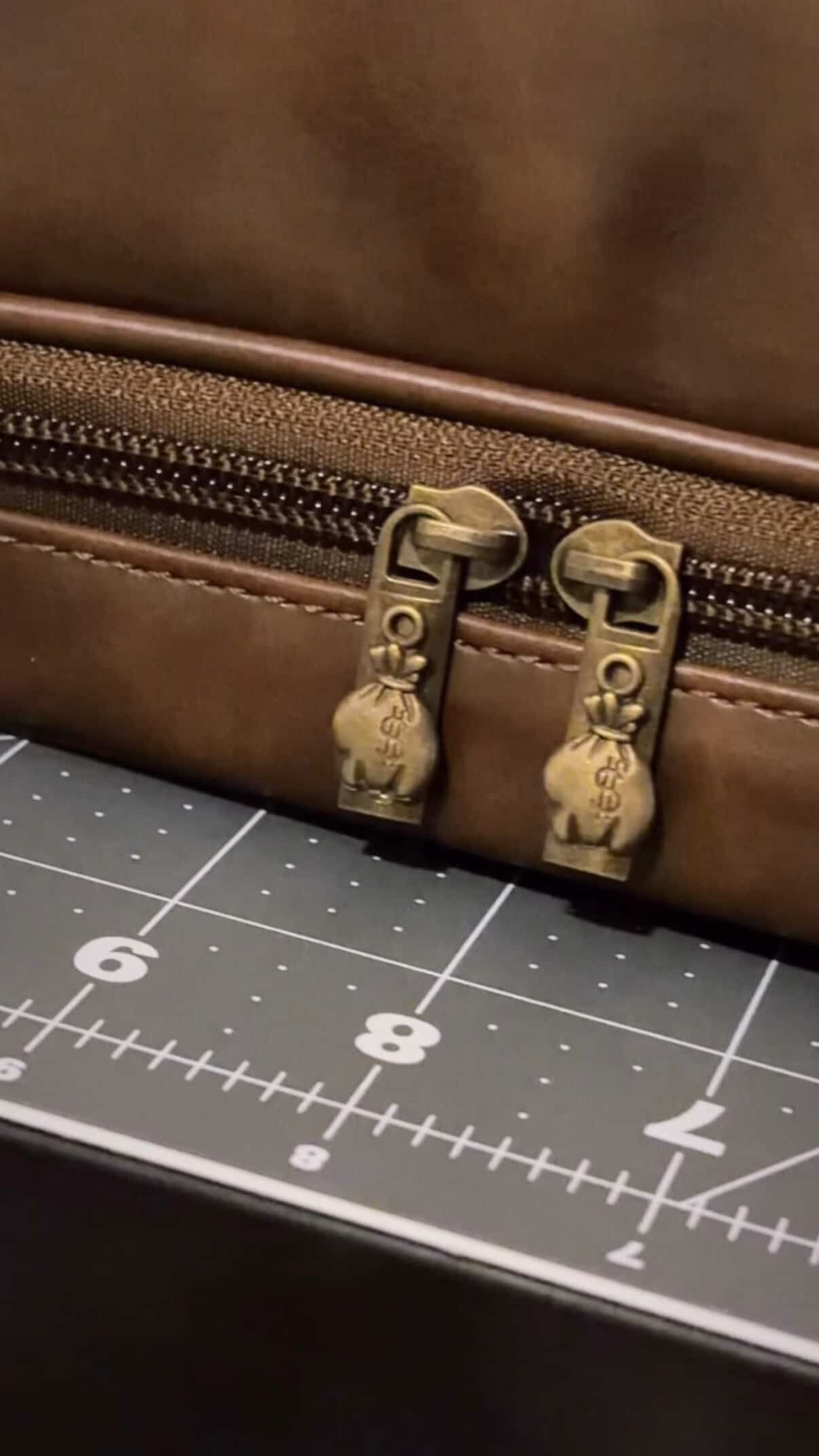 Features a soft brown leather exterior with money print interior lining in main compartment. Very spacious & versatile ; can used as a makeup bag or everyday handbag .
